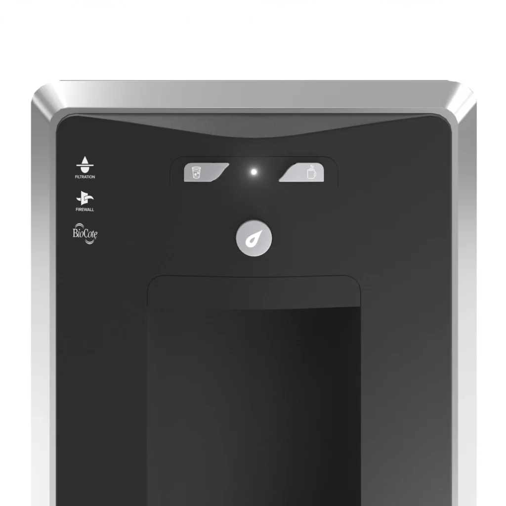 Nos distributeurs d’eau courante sont équipés de la technologie brevetée Firewall® UVC: celle-ci garantit une eau exempte de 99,9999 % de pathogènes, de la source à la distribution, en empêchant les bactéries et les virus de pénétrer dans l’eau.